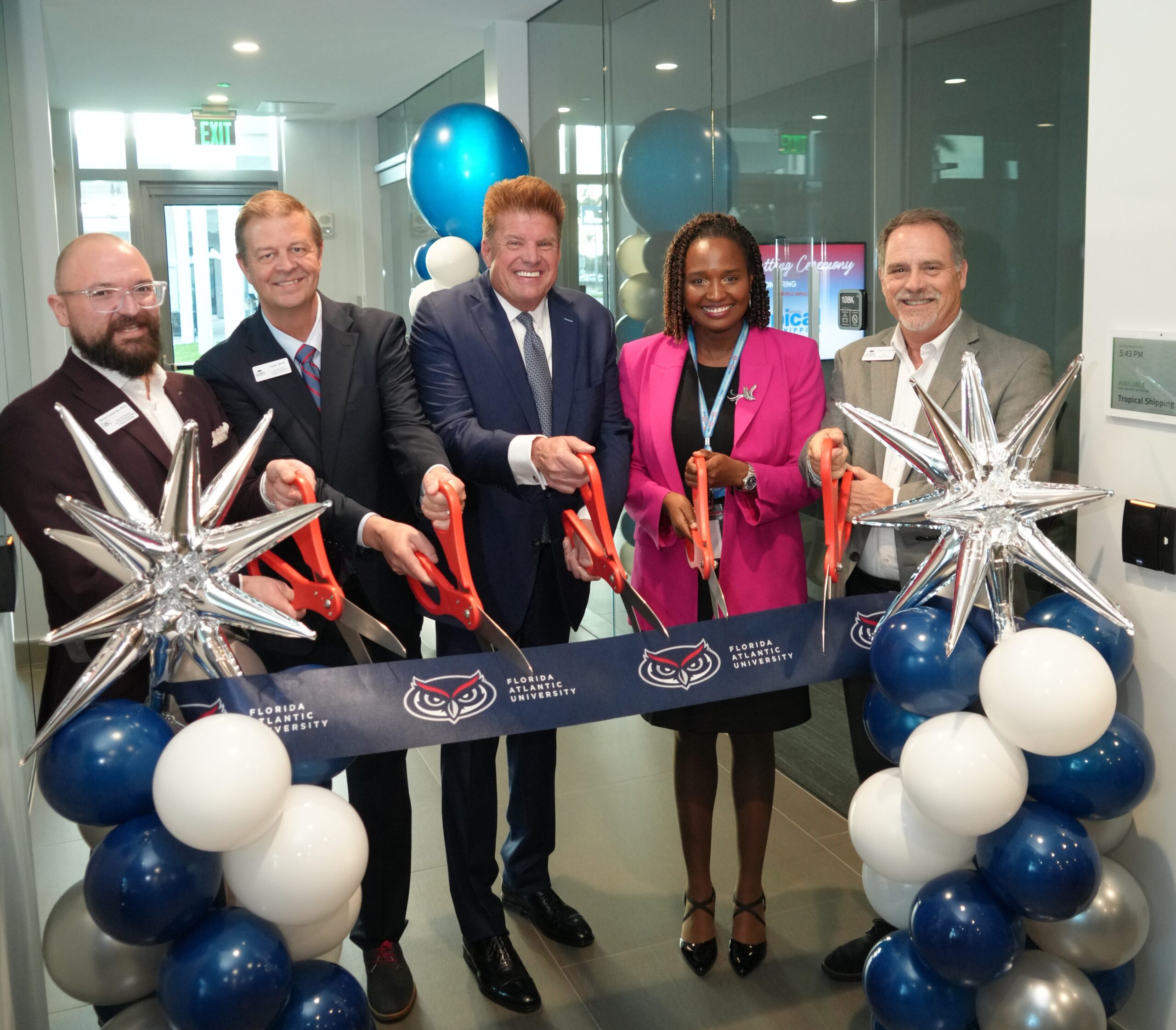 From left, Steven Carnovale, Ph.D., director of Florida Atlantic’s College of Business’ Master’s Program in Supply Chain Management and associate professor of supply chain management; Vegar Wiik, assistant dean and executive director of Executive Education; Tim Martin, CEO and president of Tropical Shipping; Kerrlene Wills, director of governmental and community affairs of Tropical Shipping; and Daniel Gropper, Ph.D., dean of Florida Atlantic’s College of Business, cut the ribbon to open the Tropical Shipping Study Room at Florida Atlantic University’s College of Business.